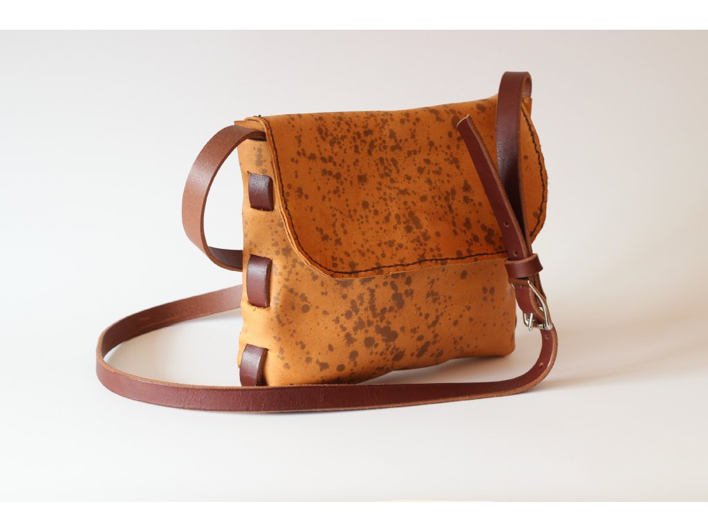 Ručně šitá kabelka z kvalitní hovězí kůže ve světle hnědé barvě. Boky jsou provlečené koženým řemínkem a zapínání je řešené praktickým magnetem.